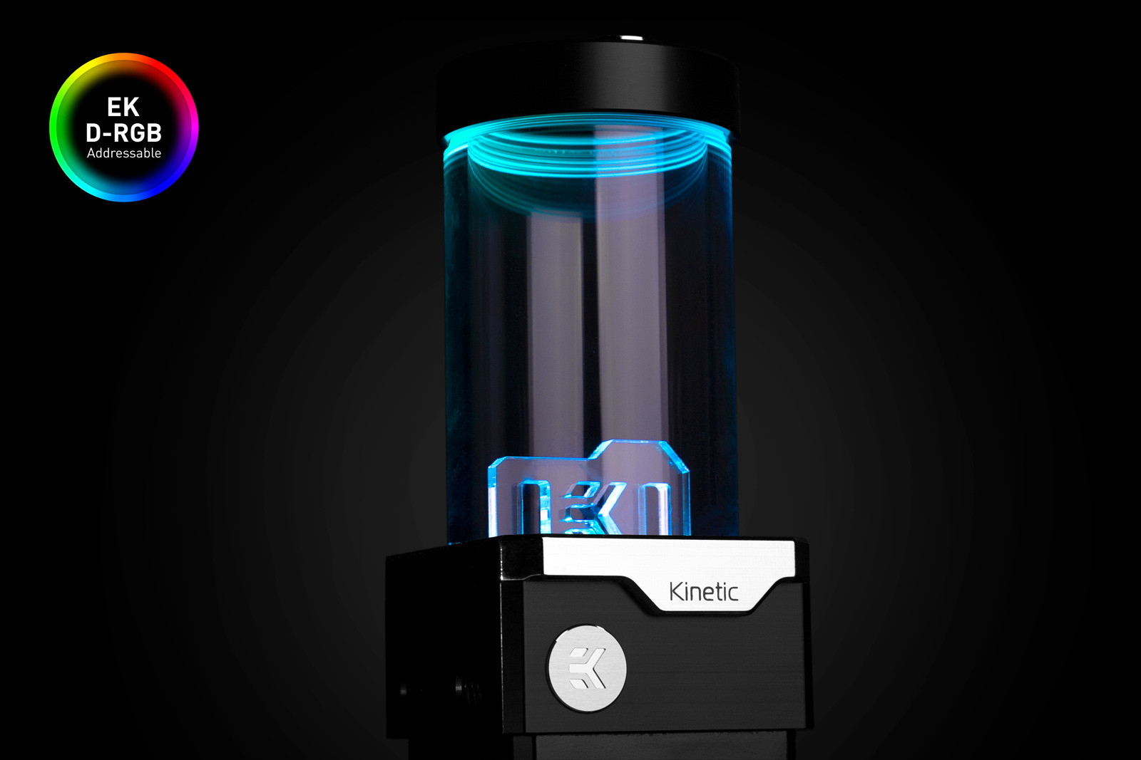 EK-Quantum Kinetic TBE 160 VTX PWM D-RGB combo unit is the new pump-reservoir assembly that is based upon a new VTX pump that is DDC mount compatible. The new Kinetic combo units are part of the EK Quantum Line of products and come with sophisticated addressable D-RGB lighting implementation and a new VTX pump that has a small footprint, high performance, and requires no additional cooling! The reservoir is equipped with a total of six G1/4“ ports so that users can choose the most optimal setup for their liquid cooling loops.
