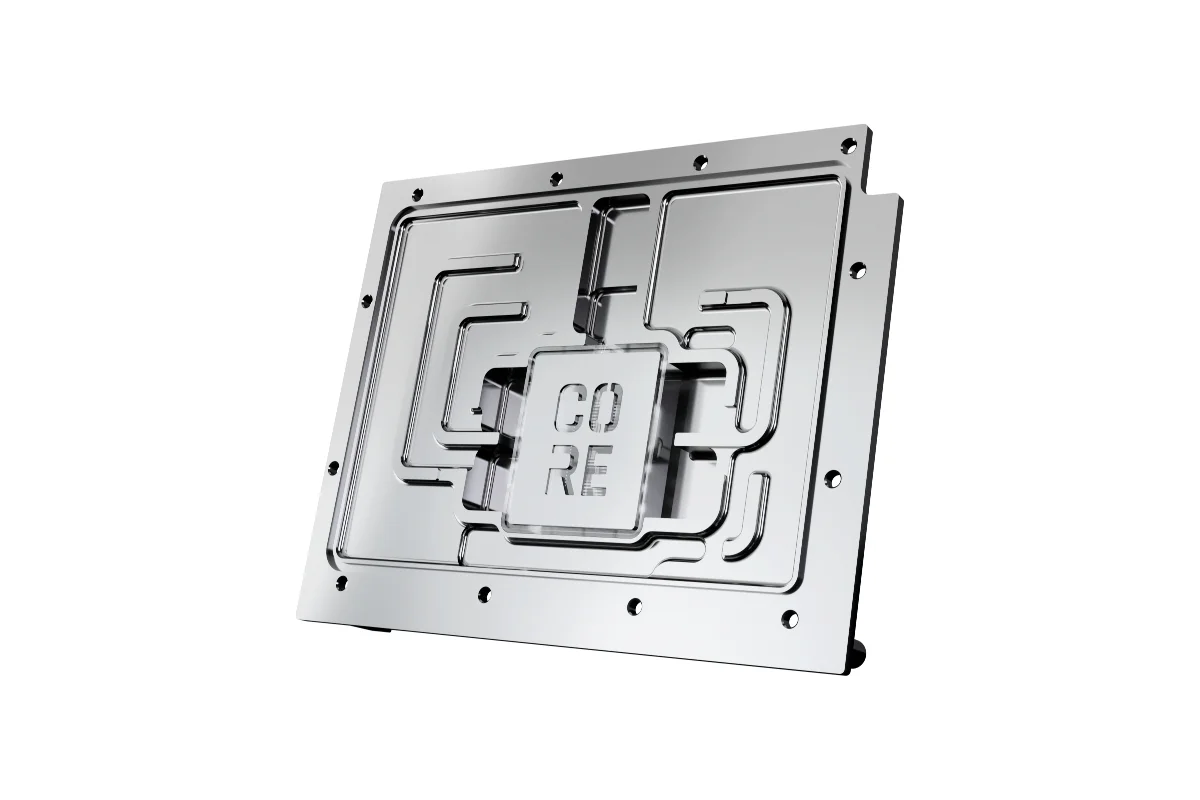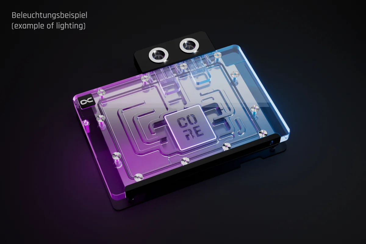 The visual design of the GPU water cooler has been slightly modified. A new highlight is the Core emblem placed above the jetplate, which emphasizes its affiliation with the Core series and visually enhances the design. The series continues to feature high-quality brass connectors that ensure optimal quality and safety. The specially adapted aluminum backplate covers the entire backside of the copper cooler, ensuring a clear and uniform appearance. The acrylic, combined with aRGB lighting, allows for even and impressive illumination of the entire cooler.