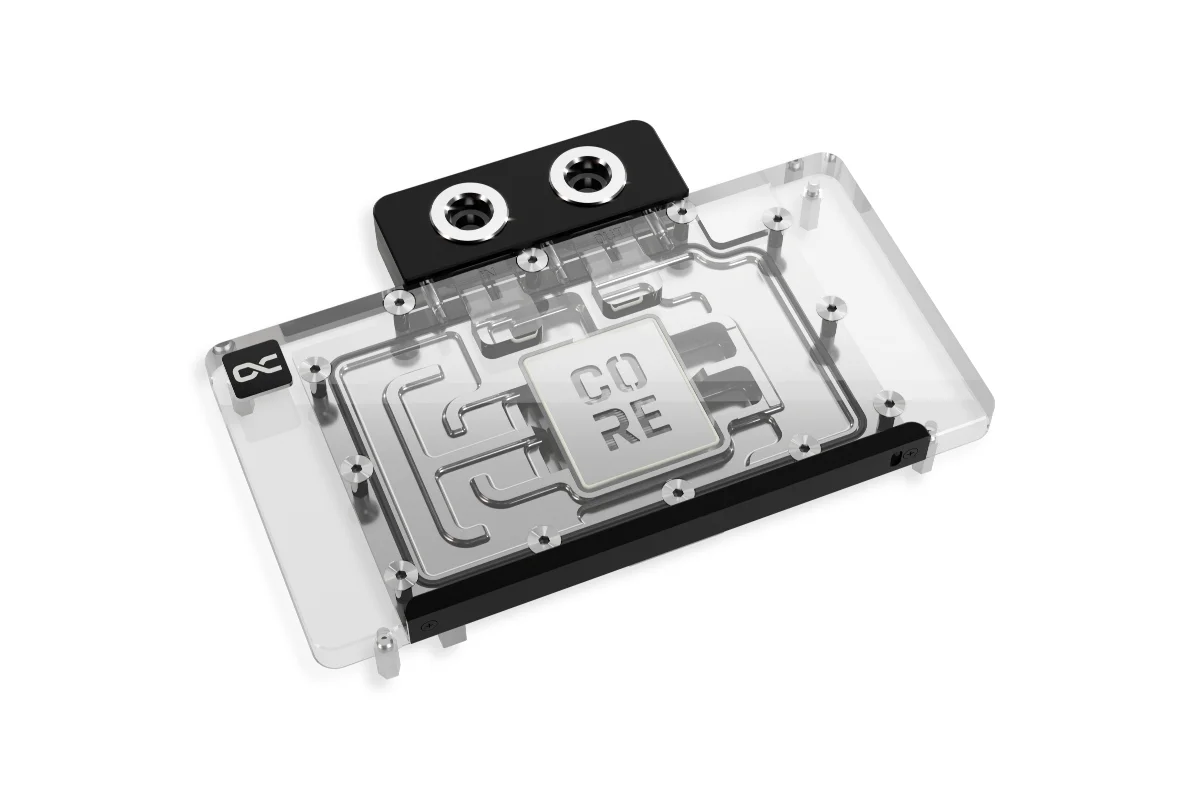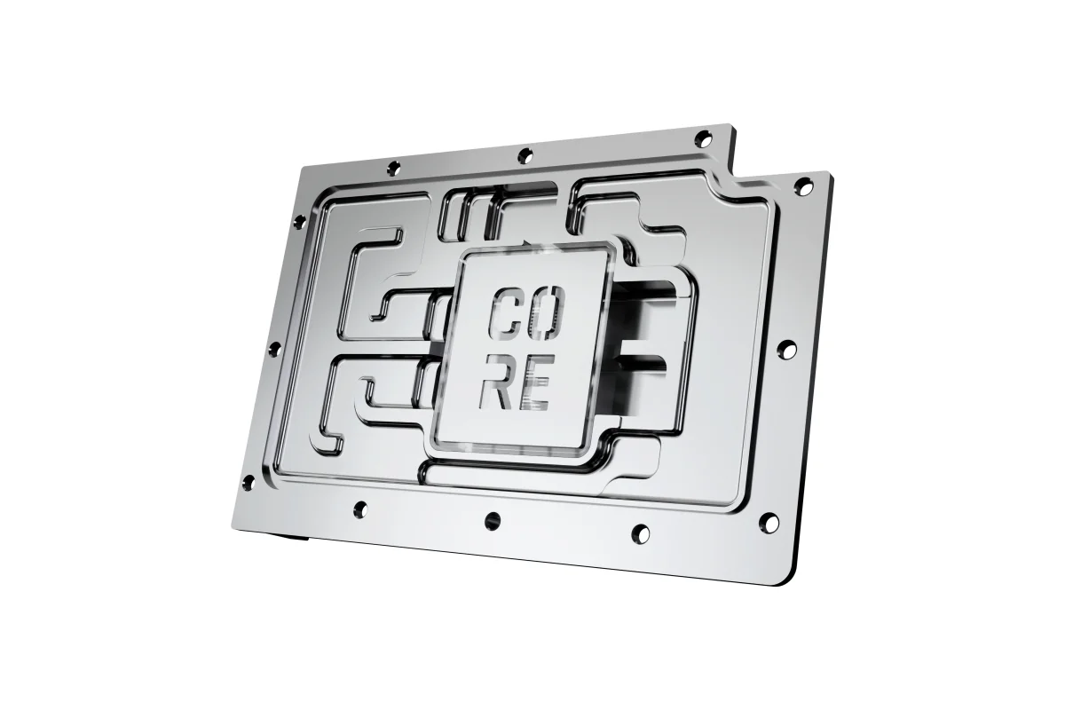The visual design of the GPU water cooler has been slightly modified. A new highlight is the Core emblem placed above the jetplate, which emphasizes its affiliation with the Core series and visually enhances the design. The series continues to feature high-quality brass connectors that ensure optimal quality and safety. The specially adapted aluminum backplate covers the entire backside of the copper cooler, ensuring a clear and uniform appearance. The acrylic, combined with aRGB lighting, allows for even and impressive illumination of the entire cooler.