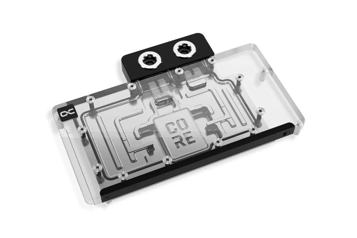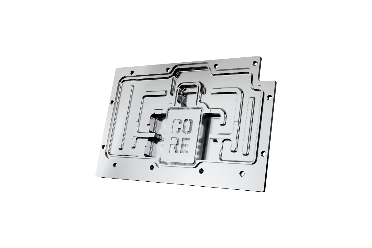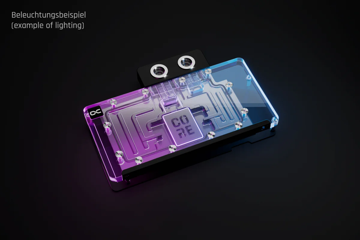 The visual design of the GPU water cooler has been slightly modified. A new highlight is the Core emblem placed above the jetplate, which emphasizes its affiliation with the Core series and visually enhances the design. The series continues to feature high-quality brass connectors that ensure optimal quality and safety. The specially adapted aluminum backplate covers the entire backside of the copper cooler, ensuring a clear and uniform appearance. The acrylic, combined with aRGB lighting, allows for even and impressive illumination of the entire cooler.