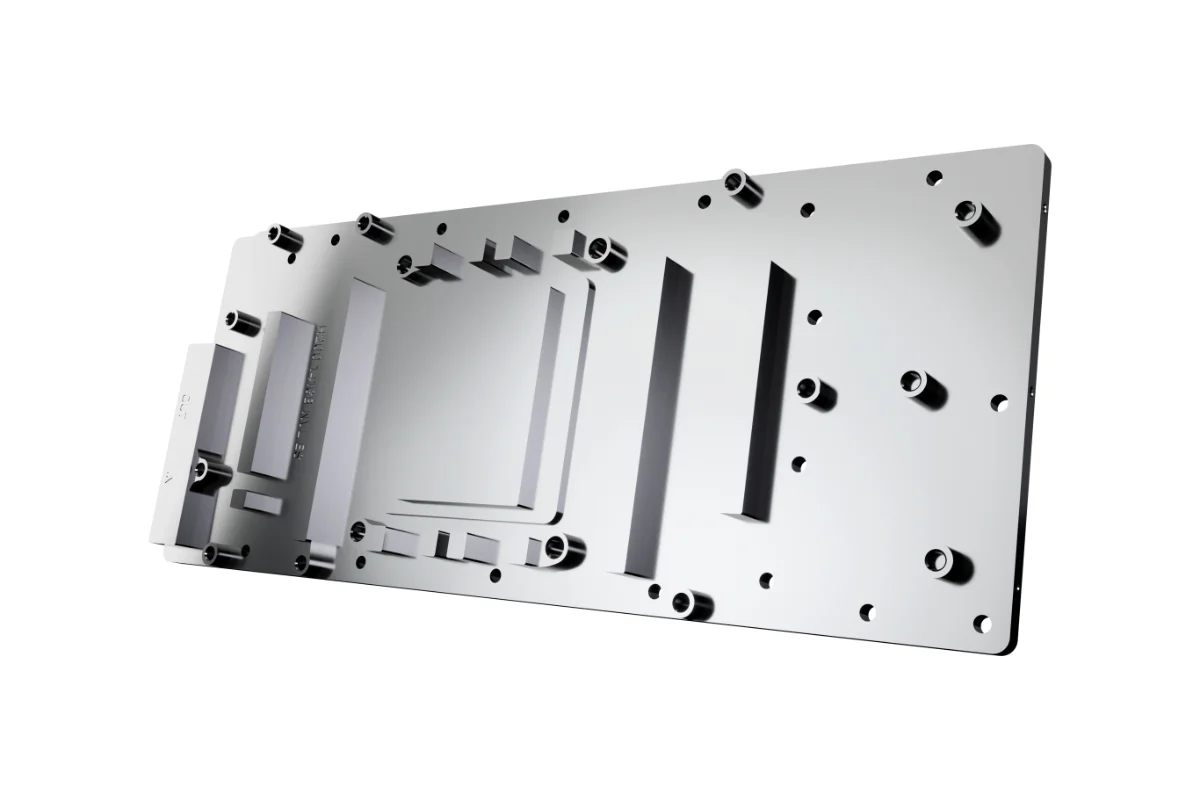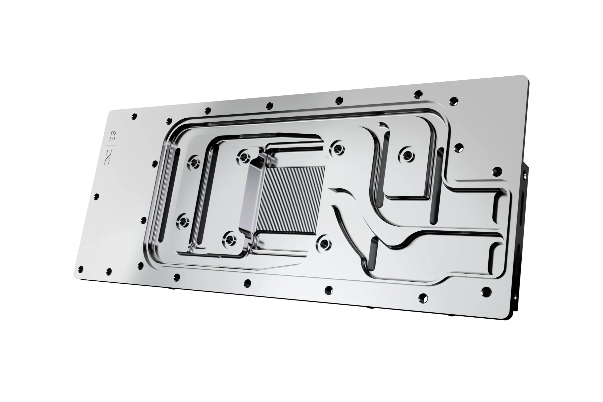 The cooler’s inlet and outlet ports are placed at the rear of the block to save space. This connector layout simplifies tubing and integration into existing cooling loops, even within the tightest server chassis. The optimized internal channel structure ensures highly efficient heat dissipation from GPU, VRAM, and power delivery components. A precise flow path within the cooler ensures consistent water distribution across all critical areas.