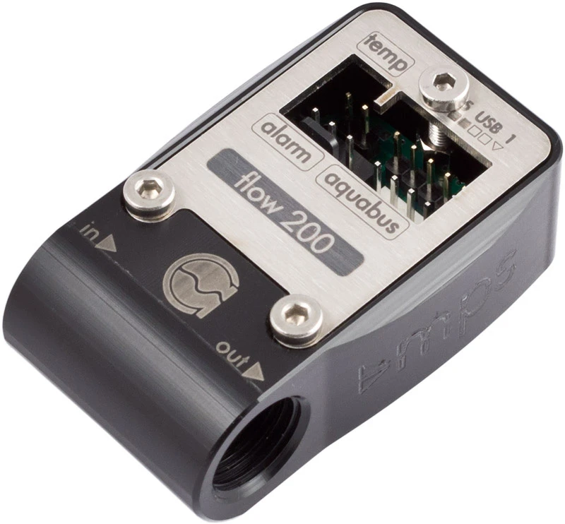 The mps flow sensors feature an integrated microcontroller with USB and aquabus interface, a programmable alarm output, an integrated water temperature sensor and an external temperature sensor input. For monitoring and configuration, the aquasuite software can be downloaded free of charge. In addition to the USB interface, the 4-pin aquabus interface can be used to directly connect the flow sensor to an aquaero 5 controller (not included in delivery). The alarm output can be configured to be used as a rpm signal to be connected to a fan connector with fault detection (for example motherboard fan headers) or to be used as a switched output for example to connect a LED. Flow signal, water temperature and external temperature sensor input can be configured to raise an alarm. The external temperature sensor input is compatible with all Aqua Computer temperature sensors.