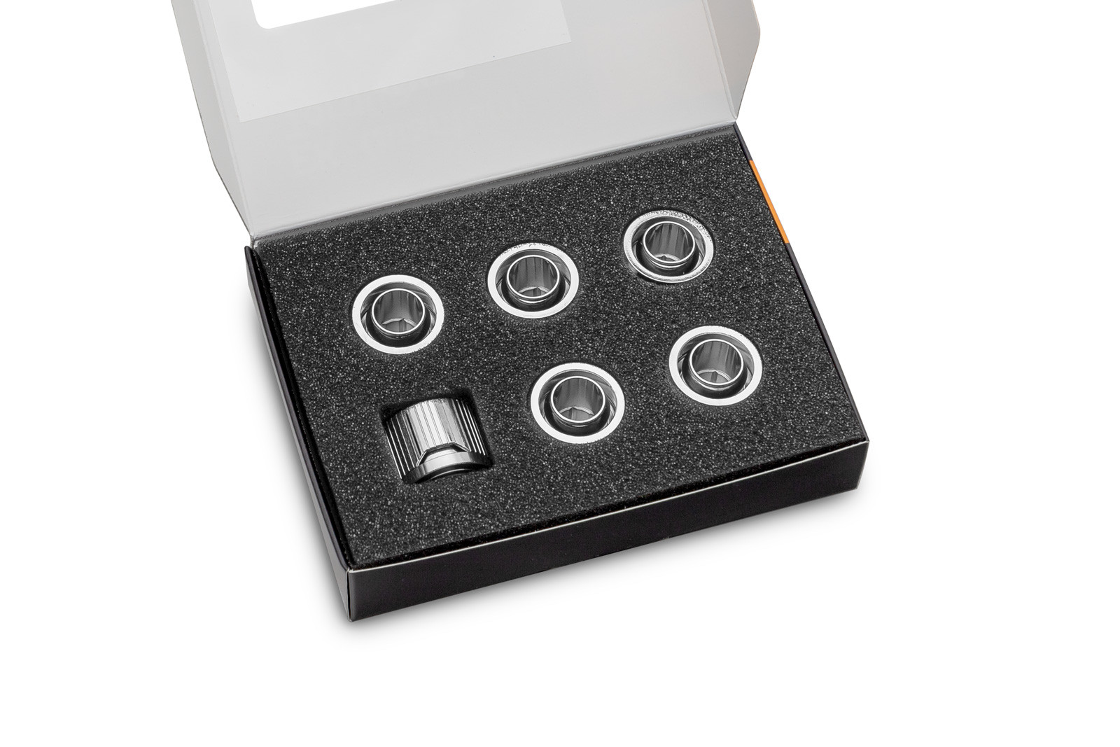 EK-Quantum Torque 6-Pack STC 12/16 is a fitting multipack containing six EK-Torque STC fittings. These are EK's premium 12/16mm (ID/OD) soft-tube compression fittings designed for use with various flexible soft tubing types such as PVC, EPDM, Norprene, silicone or any other type of compatible flexible tube. With a non-intrusive, yet striking look, and with NO added branding at all. They can be complemented by interchangeable aesthetic color rings, and are an ideal choice for anyone and a perfect match with EK-Quantum series products.