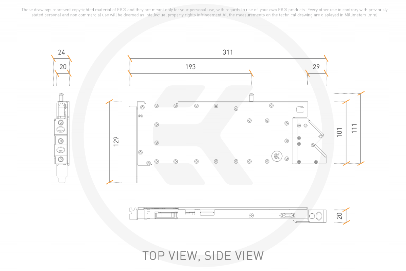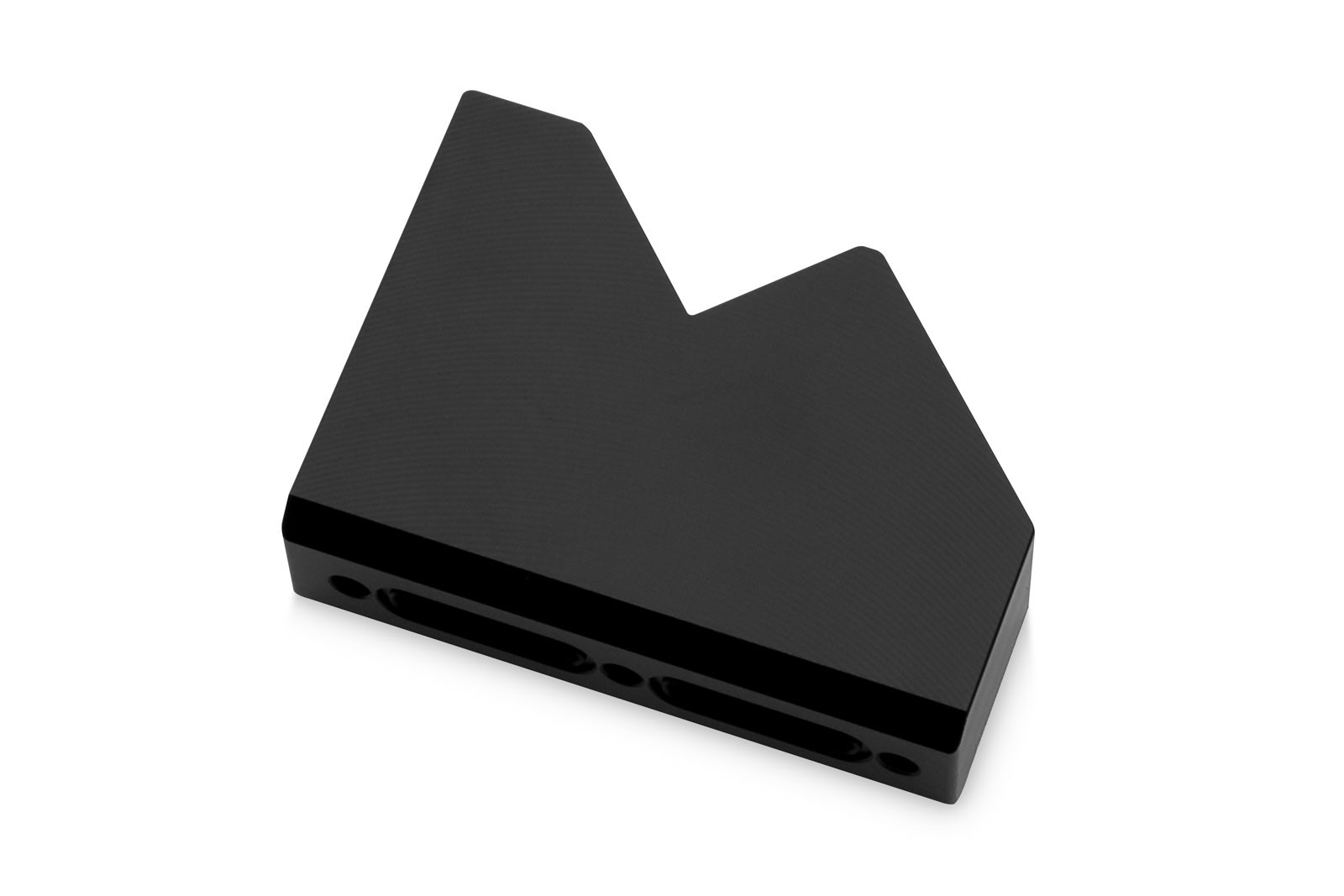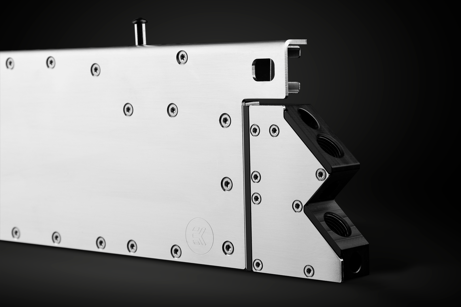 At the back, this version of the EK-Pro A5500 GPU water block features a 45°-angled terminal block made of POM and machined stainless steel. It has two G1/4” ports, allowing easy integration with EK-Pro QDC kits and manifolds for high compute density applications. Additionally, the water block is equipped with a side-mounted standoff for GPU brace applications, ensuring secure GPU mounting during transport and movement of the chassis