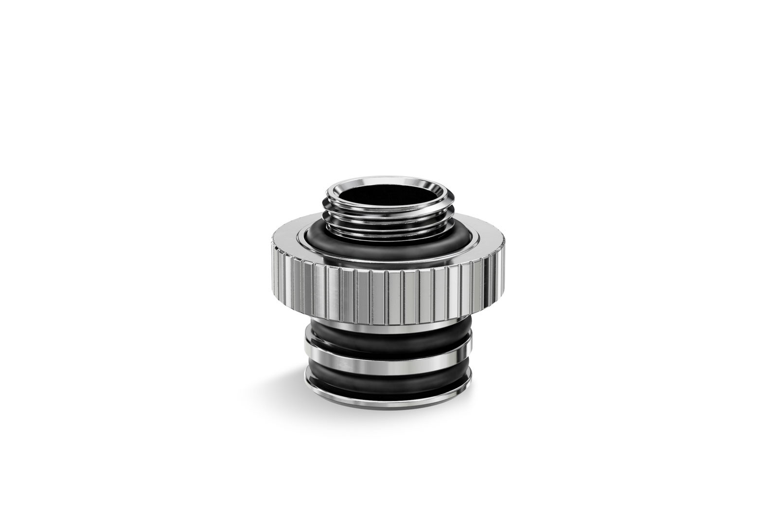 EK-Quantum Torque Push-In adapter M 7 - Nickel is EK's new push-in fitting designed for use exclusively with EK-Quantum Reflection² distribution plates. It has a standard G1/4" male thread with an o-ring at one end, a knurled midsection much like the Quantum Torque Static Extenders, and a male push-in part with two o-rings at the other end that pushes directly into the distro plate without screwing.