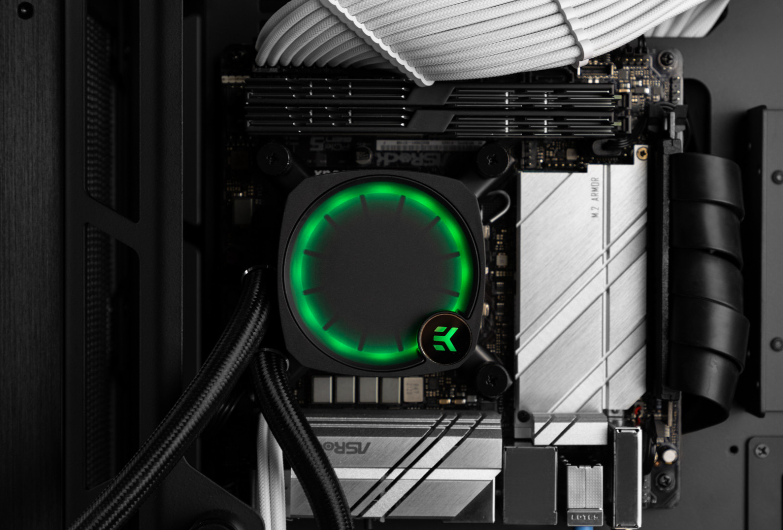 The improved position of rotary fittings on the other side, which are now placed next to each other, allows the EK-Nucleus AIO to be installed in even the tightest spaces.