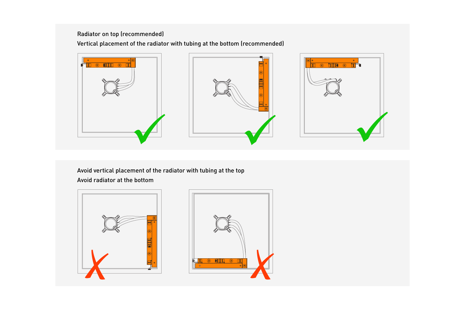 The top allows you to re-orient the D-RGB EK badge no matter in which direction the cooler is installed. The orientation can be changed in 90° increments, so if the cooler is installed upside down, rotate it 180 degrees to display the logo right side up. Regardless of the angle needed to install the AIO, it will always offer clean and aligned aesthetics.