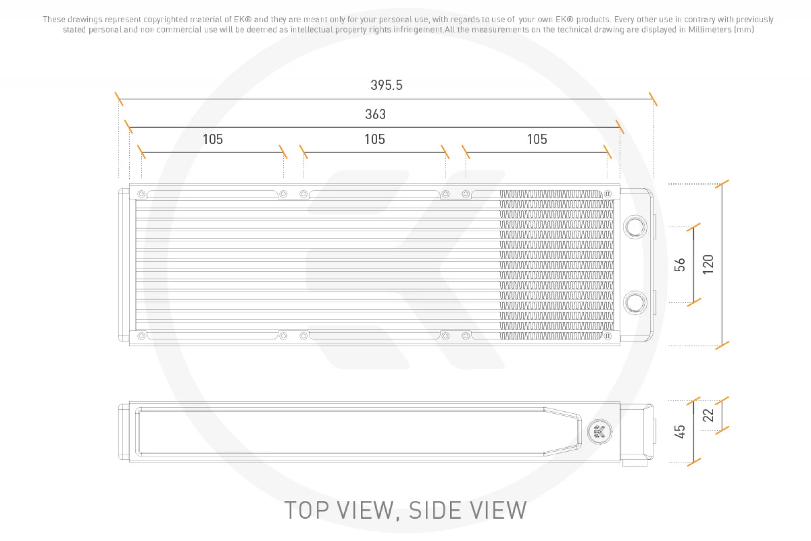 With the supplied screws, this radiator is compatible with 120mm fans that have a standard 25mm thickness. EK recommends using EK fans or similar ones with sealed-edge frames. This classic yet effective square shape of the fan casing provides optimal performance in either the pull (suction) or push (pressure) regime without any hydraulic losses, thus ensuring the optimal cooling capacity of your liquid cooling radiators.