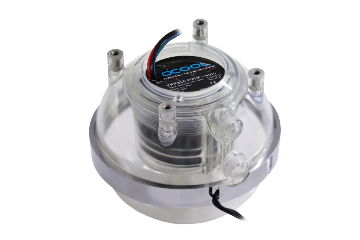 The pump disappears completely inside the Eisball. It is inserted into the Eisball from below and fastened with a special pump holder. All Alphacool's own D5 style pumps such as the VPP655 and VPP755 as well as all original Laing D5 pumps are suitable for installation.